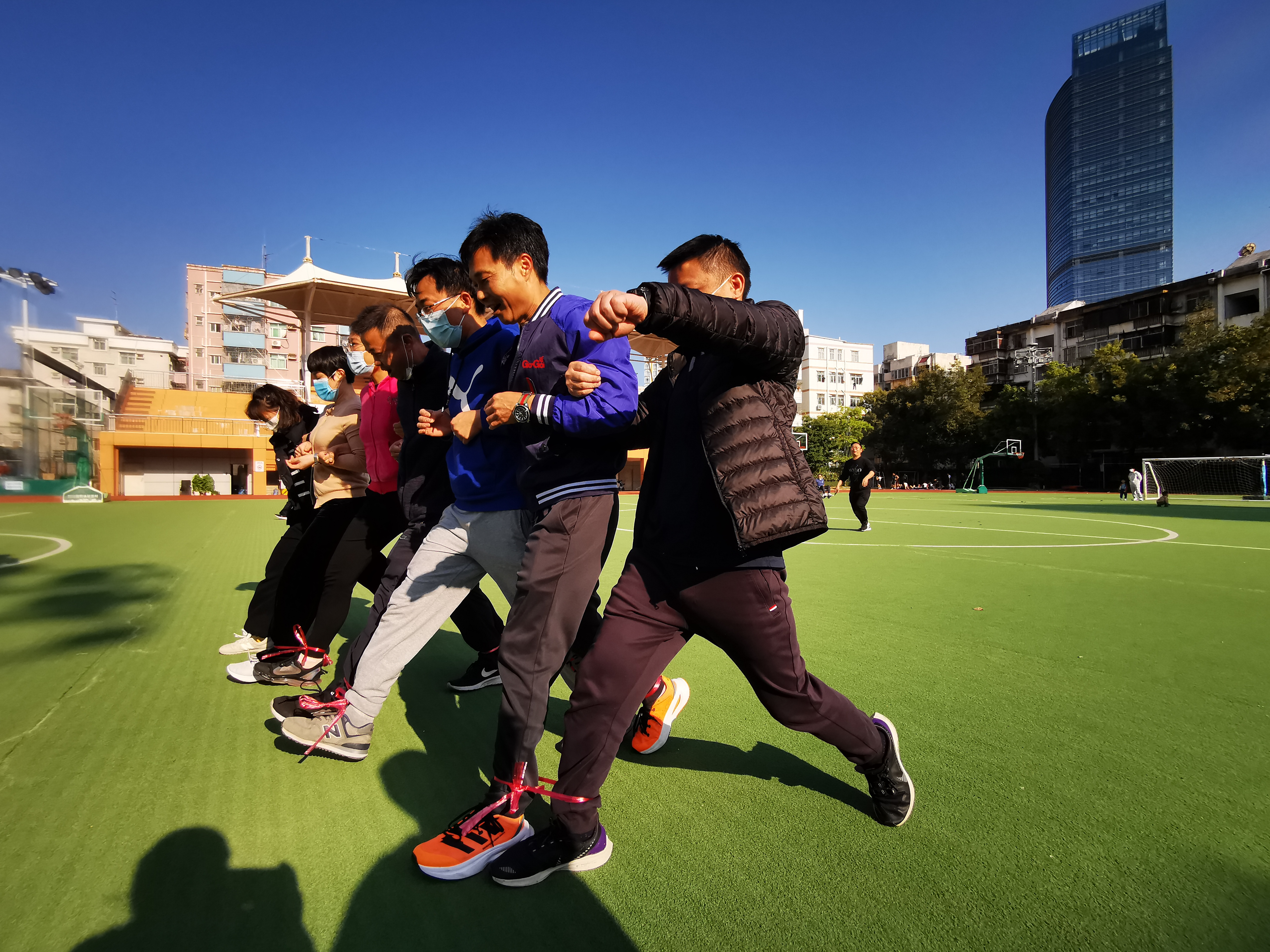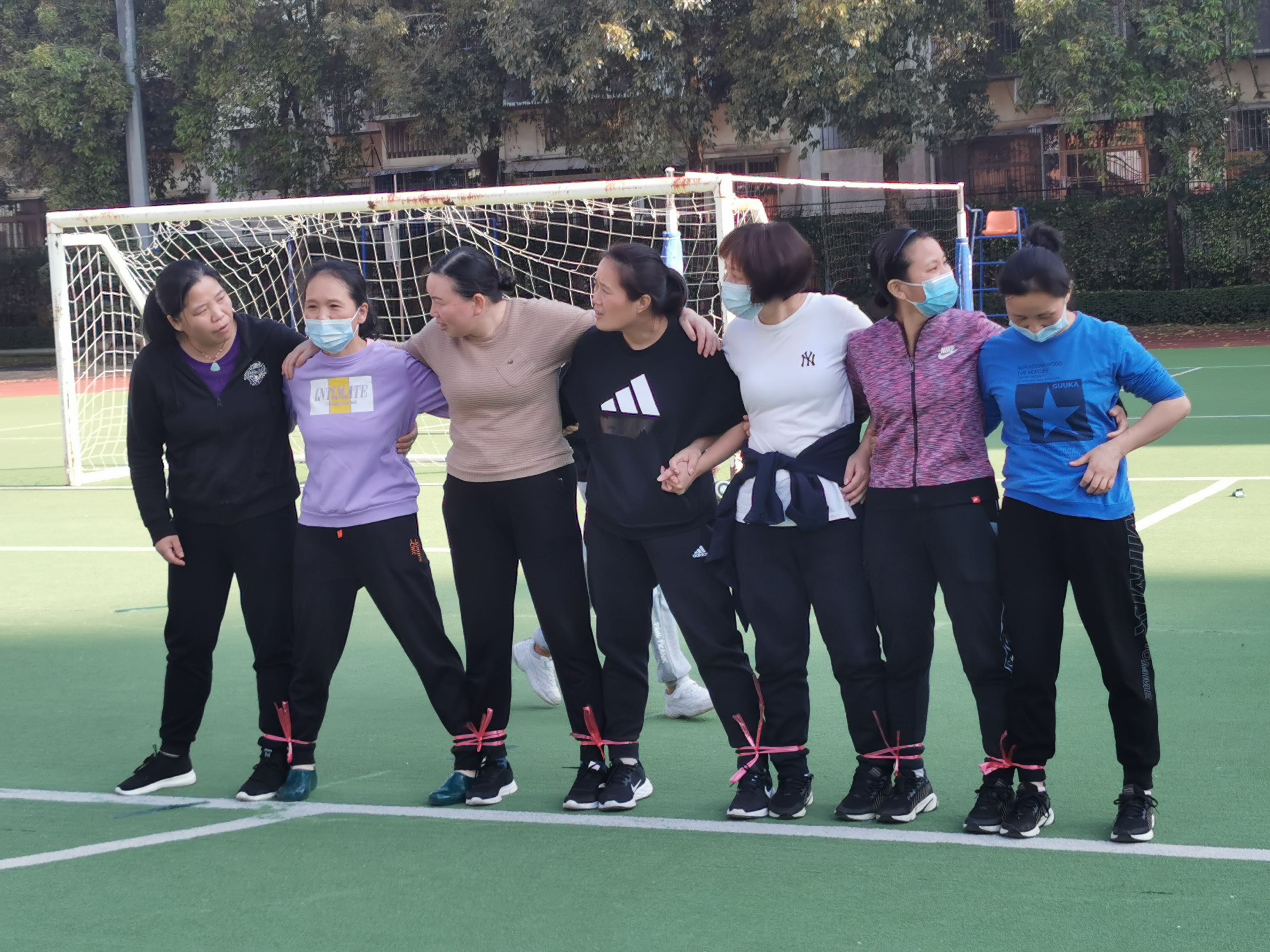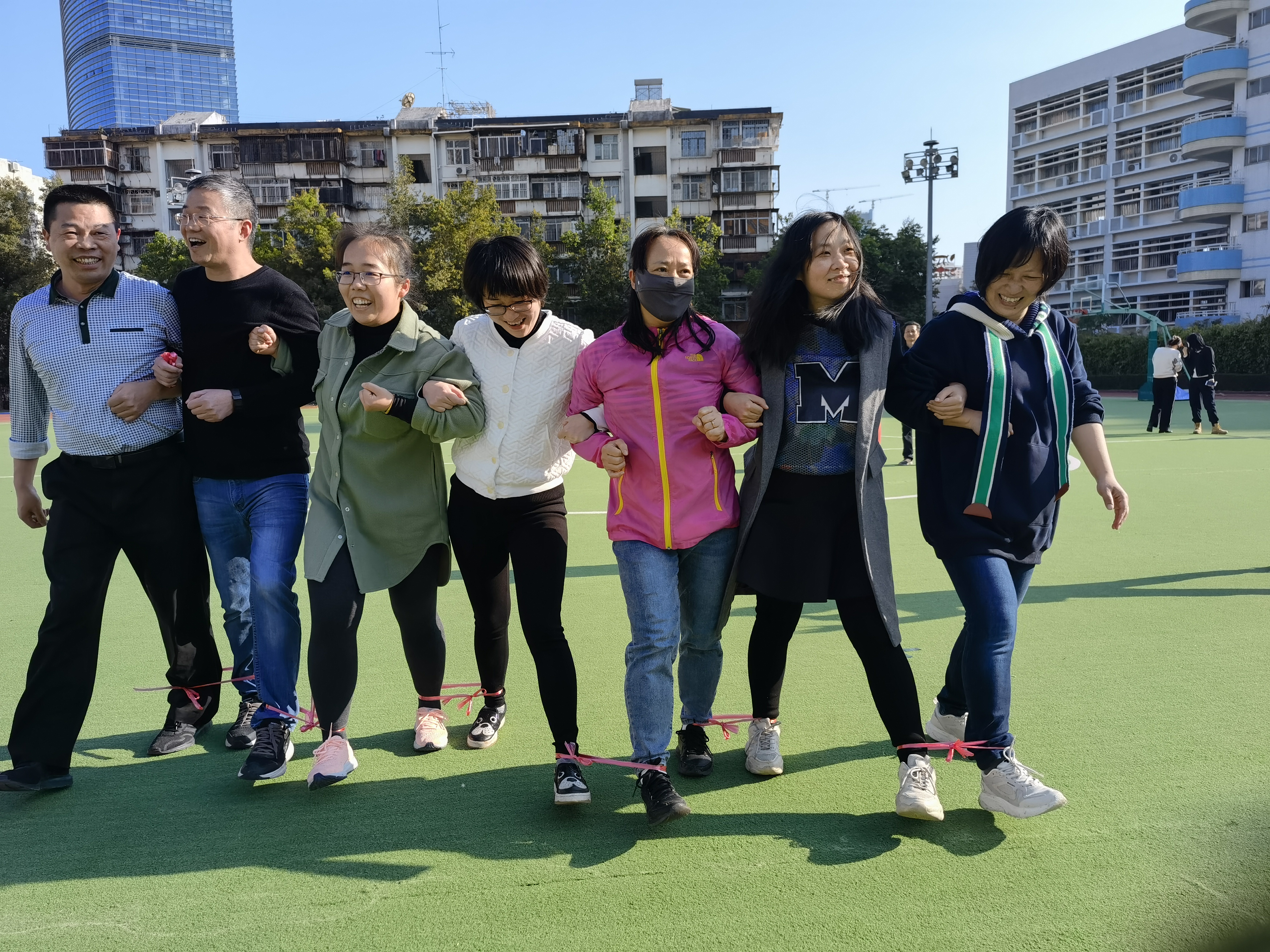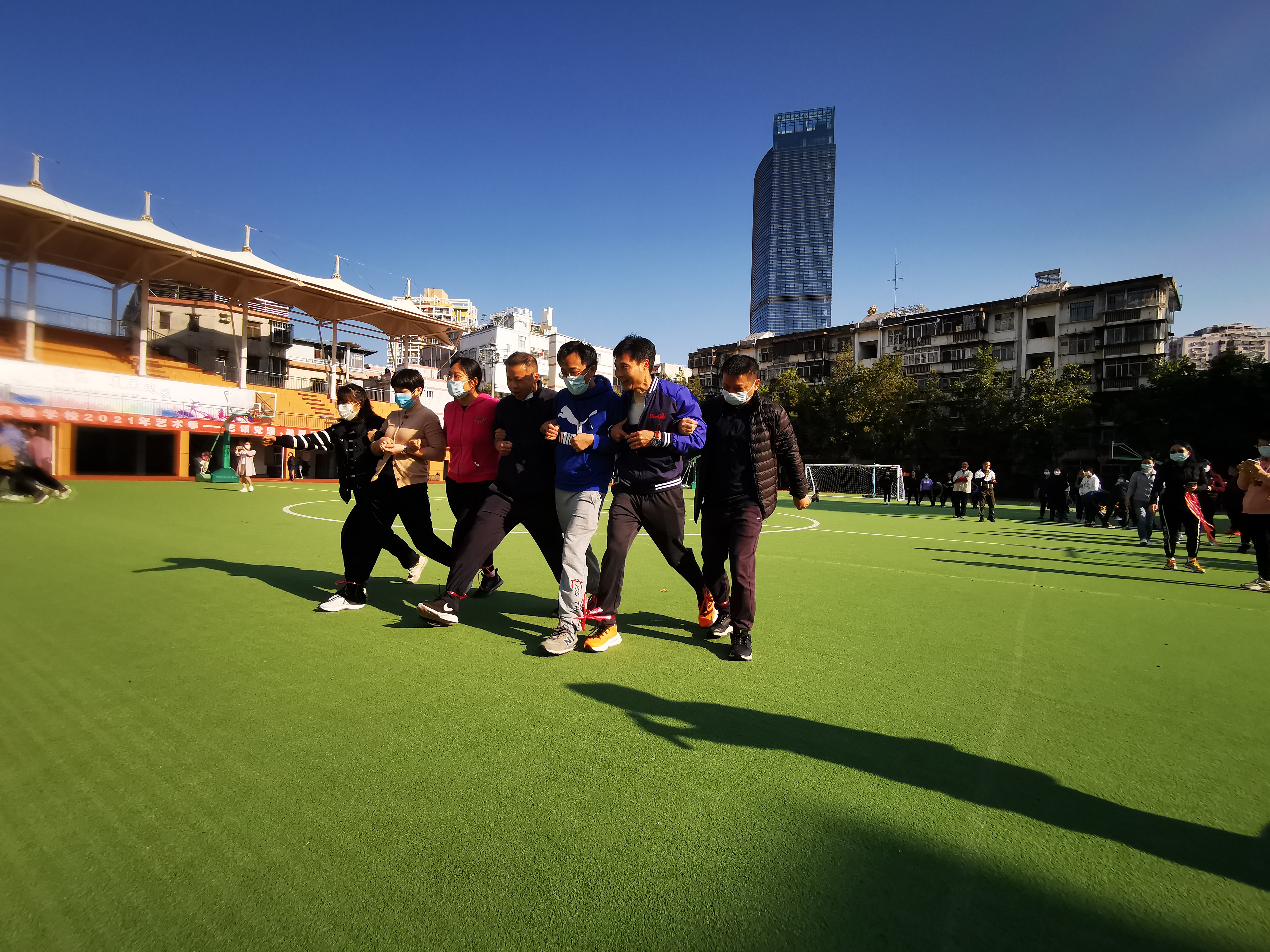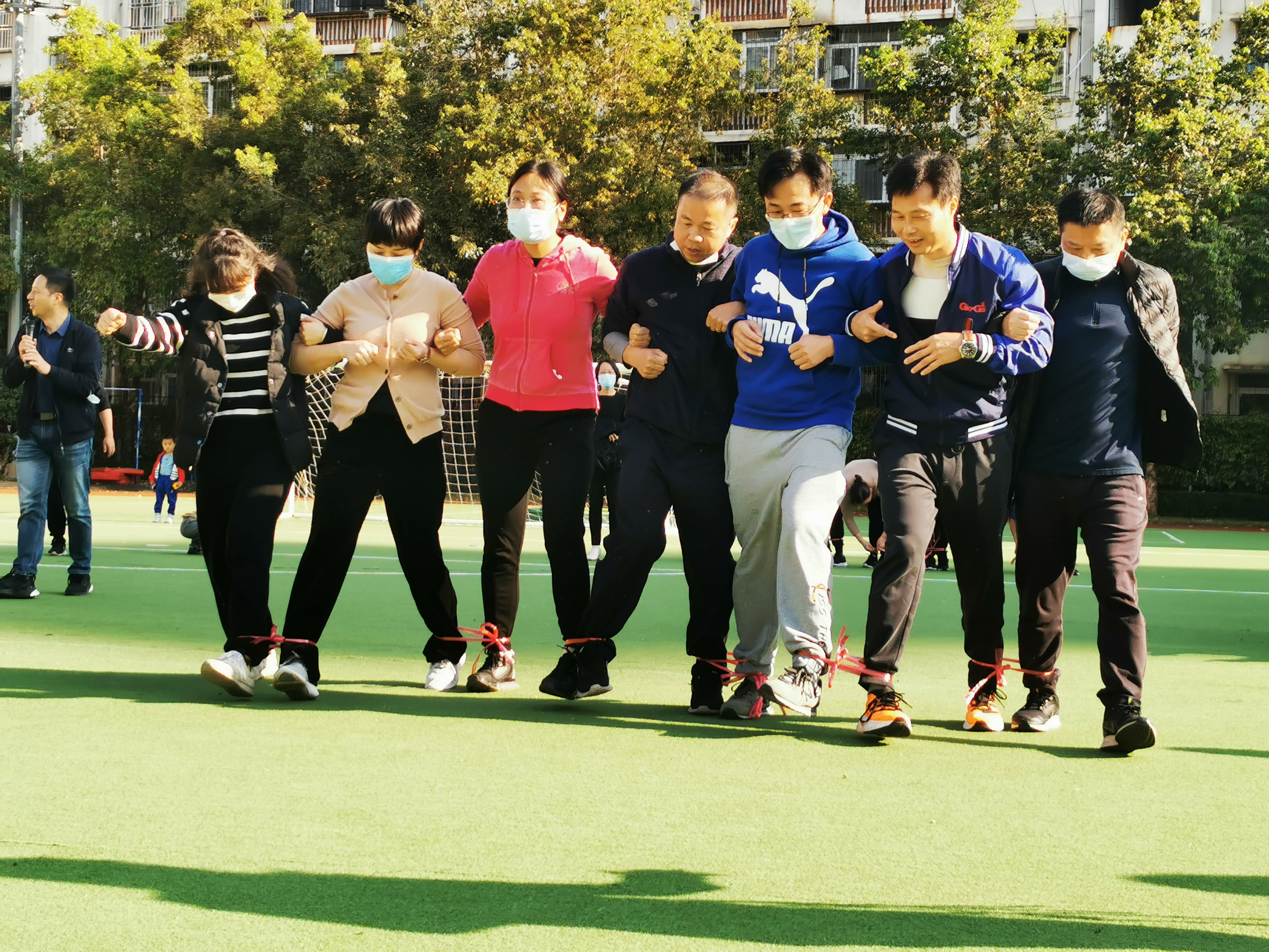 教职工七人八足赛,肩并肩,脚连脚,踏着一二、一二的节奏,奋力冲向终点。