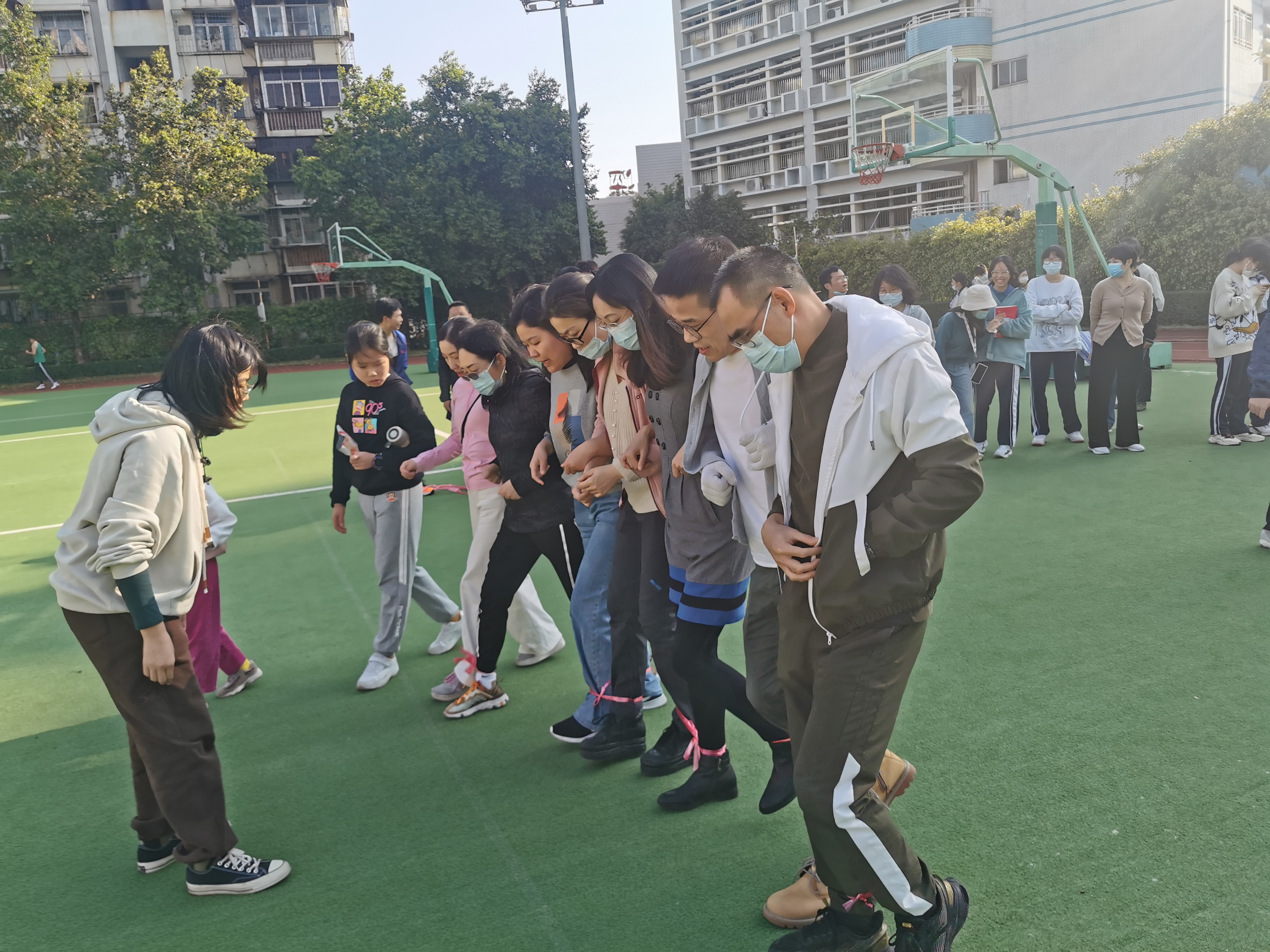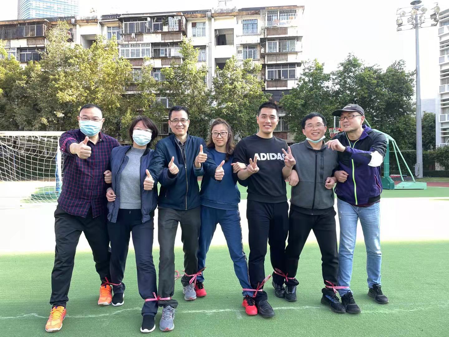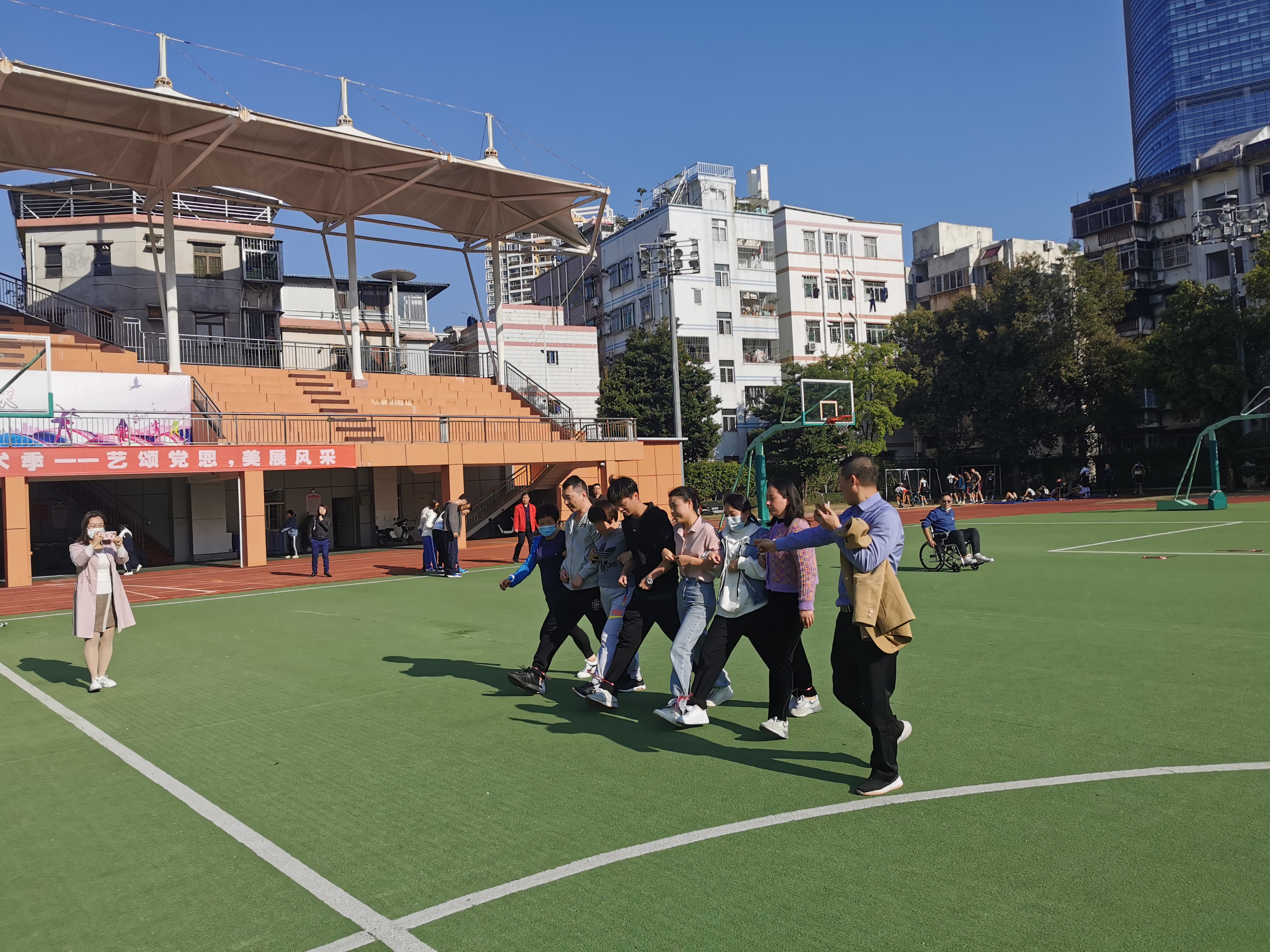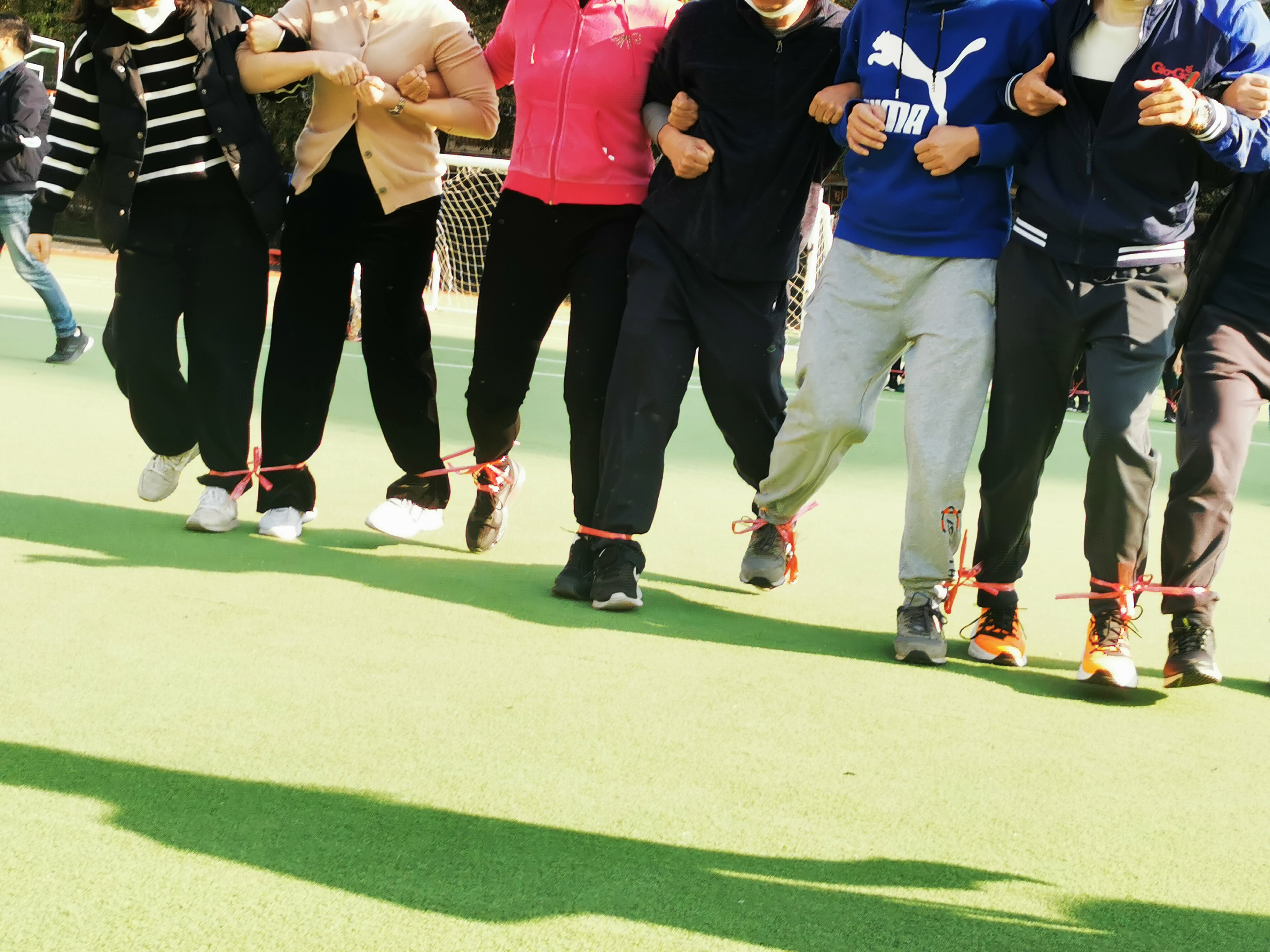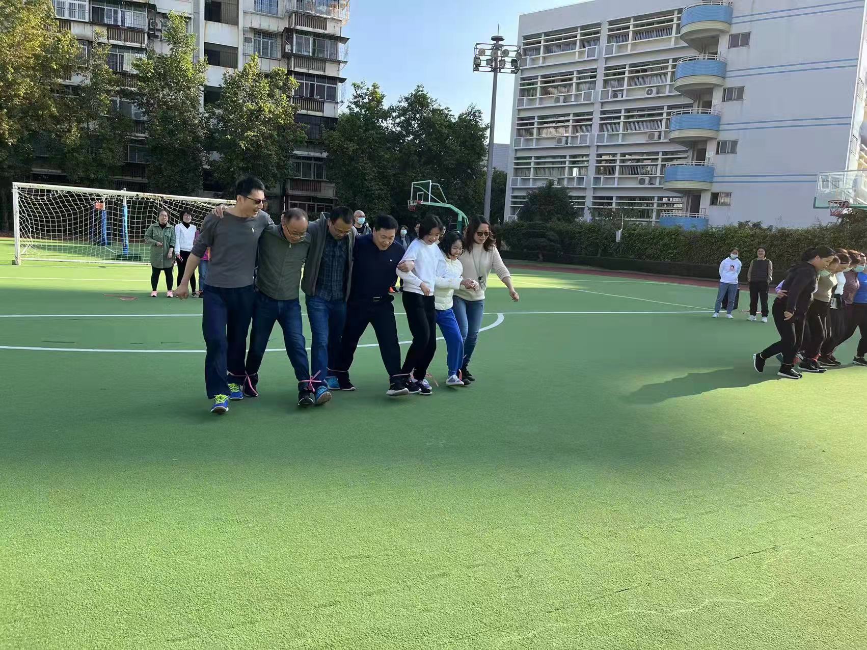教职工七人八足赛,肩并肩,脚连脚,踏着一二、一二的节奏,奋力冲向终点。
