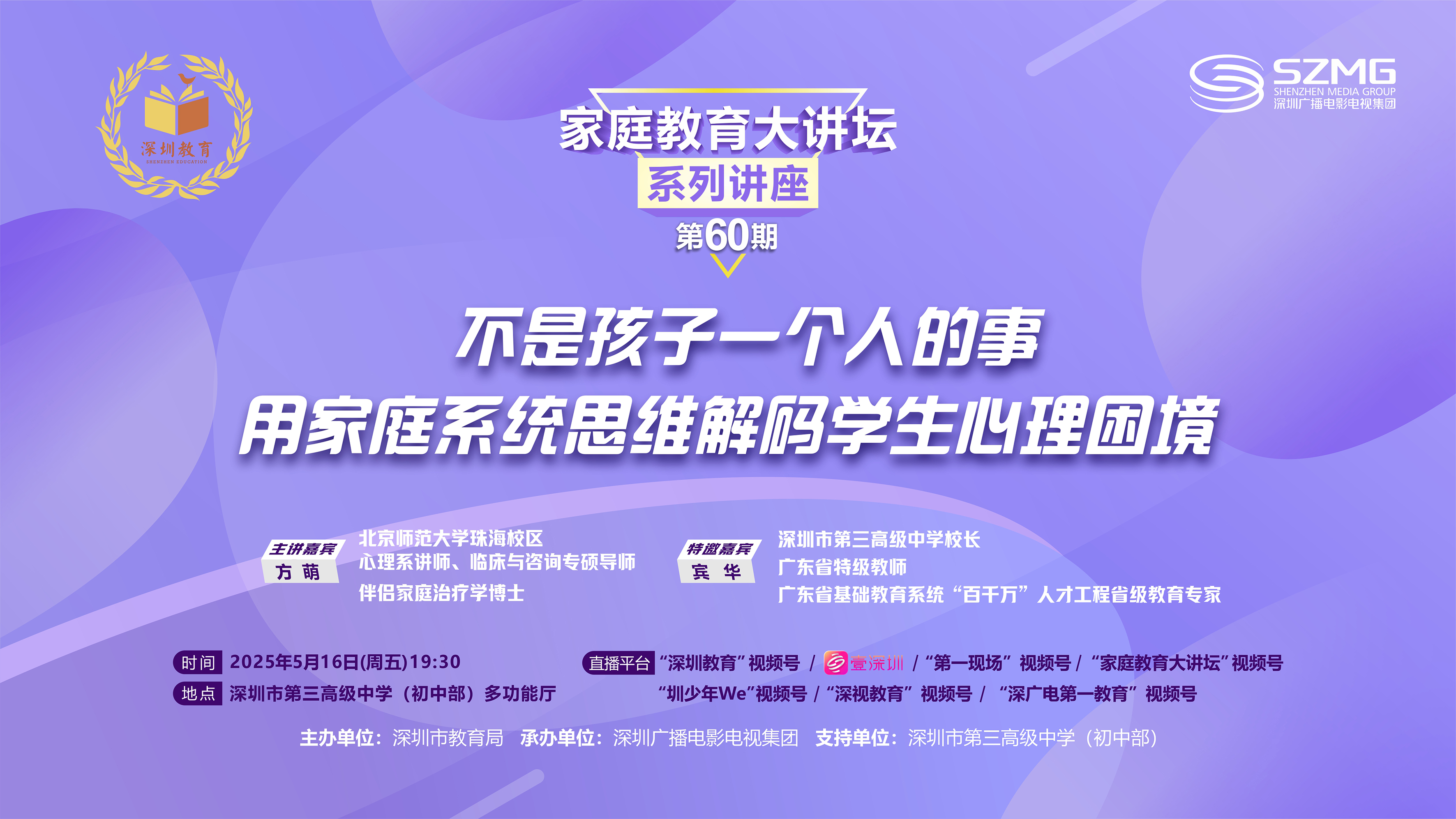 网络播出:网络播出:壹深圳、“深圳教育”微信视频号、“家庭教育大讲坛”微信视频号、 “圳少年We”微信视频号、“深视教育”微信视频号、“深广电第一教育”微信视频号等平台