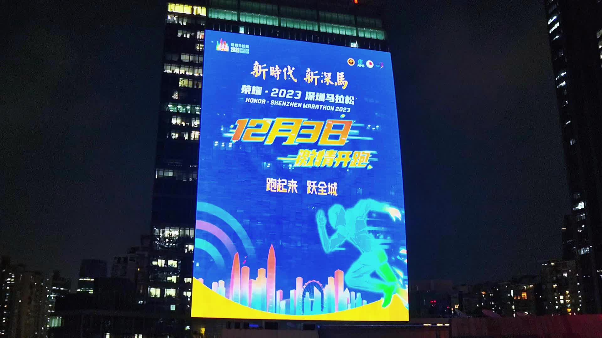 深马旋风 燃爆全城 湾区之窗大屏引领深圳广电全媒体矩阵,为荣耀·2023深圳马拉松打call,12月3日共赴一场奔跑的约定,跑起来,跃全城~