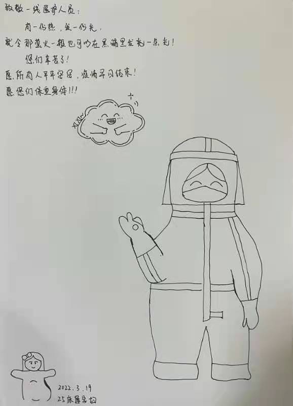 3月16日,小莉找护士要了5张A4纸,想要用漫画的形式,感谢医护人员。这之前她从来没学过画画,小心翼翼地抽出2张来练习,心里还担心画得不好会被嫌弃。但最后,她淡定了:“画得不好,心意最重要,画大白能让自己开心,因为我觉得防疫大白真可爱。”