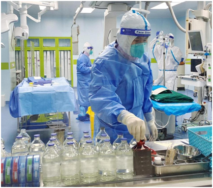 (图片:介入层流手术室,医护正在“二级防护+铅衣”下进行急诊介入手术)