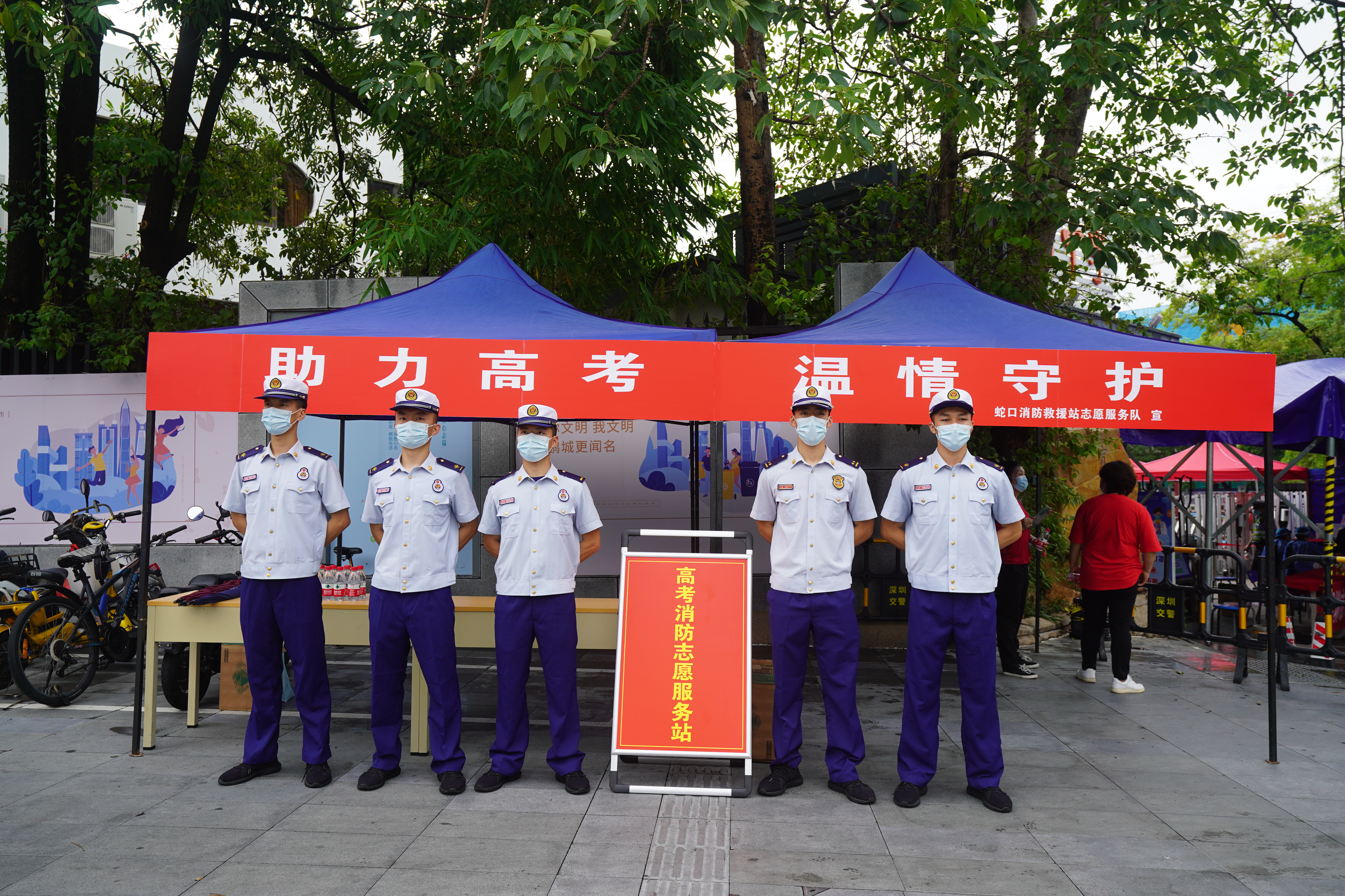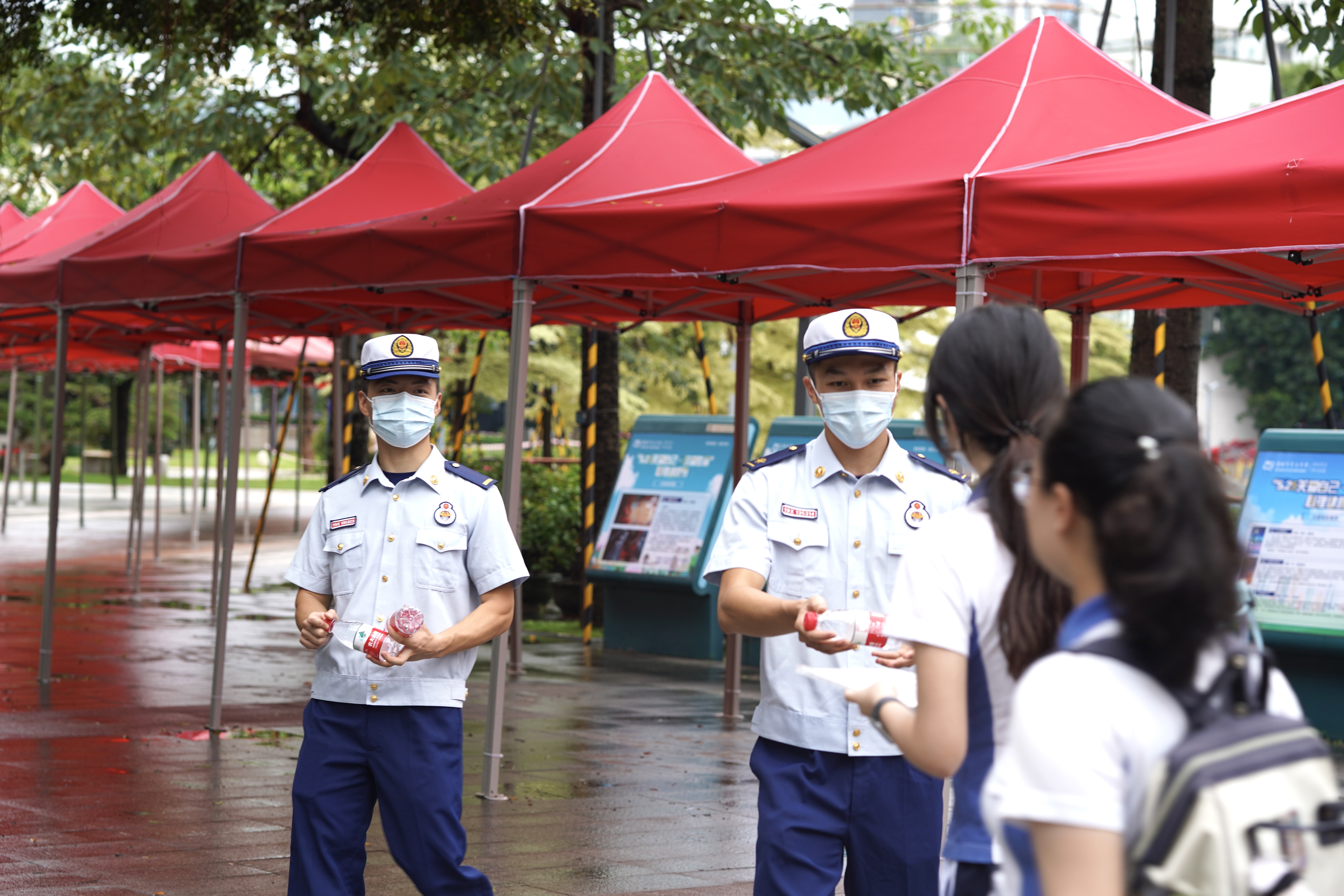 在高考前夕,南山消防救援大队还成立了消防志愿服务队,驻守在辖区内的高考考点,在为高考保驾护航的同时,为考生家长们提供了一系列的便民服务,广受人民群众的好评。在育才中学考点前,南山区蛇口消防救援站的消防员们在为考生助力加油,提供饮用水、茶歇、雨伞、应急保障药品等,还邀请学生家长到红色为主的消防车前合照留念,祝考生 一举夺“葵”、“旗”开得胜,消防队员们还将粽子挂在红色消防车头,寓意着考生们“红运当头,高“粽”状元,考试顺利,万事如意。