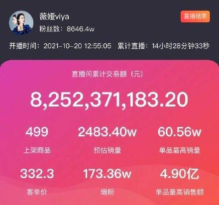 10月20日下午两点半,李佳琦准时开播,连续直播时长共计12个小时26分,累计PV(Page View,访问次数)达到2.49亿,累计UV(Unique Visitor,访问人数)达到3531.19万。淘宝直播数据显示,李佳琦10月20日晚共上架439件商品,直播间累计交易额高达106亿元,预估销量达3615.81万。此外,单品最高销量为187.77万,单品最高销售额为1.67亿元,客单价为294.64元,增粉283万人。 薇娅比李佳琦的开播时间更早,10月20日12点55分开播,累计PV达到2.39亿,累计UV达到3580.10万。薇娅直播间上架商品共计499个,累计直播时长14小时28分钟,直播间累计交易额达82.52亿元,客单价332.3元。预估累计销量为2483.40万,单品最高销量为60.56万,单品最高销售额为4.9亿元。 从李佳琦薇娅直播间的产品分类销售情况看,美容护肤类产品均为销售排行第一的品类。