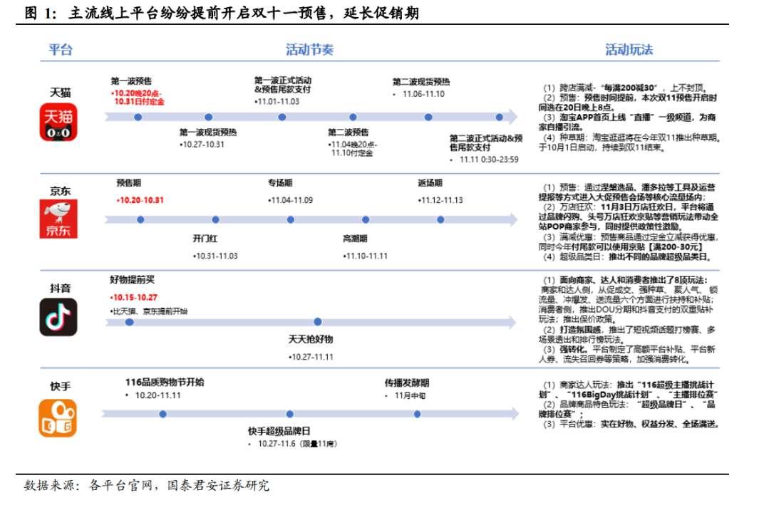 李佳琦、薇娅直播间销售最大的品类是护肤美妆类。对于化妆品,国泰君安称,分渠道看,国际高端品牌在免税渠道价格优势突出,国货品牌在超头直播间的促销力度最强,疫情影响下免税渠道购买门槛的降低,或对有税渠道造成一定分流。国泰君安研究称,天猫体系内,国际高端品牌在天猫官方旗舰店与超头直播间的售价基本一致,主要通过加赠产品加以区分;大众国际品牌与国货品牌则大都给予超头直播间更低的价格。 天风证券报告称,2020年双十一全周期(11月1日-11月11日)销售额达8403亿元,同口径下同比增长29%,占全年网络零售总额的7.1%。展望今年双十一,各大电商平台加大对商家的支持力度,叠加直播电商助力,以及部分滞后的消费需求,第四季度线上消费相比第三季度有望改善。 天风证券认为,反垄断+互联互通为商家提供降本增效便利,直播电商驱动双十一销售增长。长期来看,在反垄断趋严的背景下,电商平台只有通过不断提升商家体验,通过商业赋能巩固商家资源,实现平台的可持续增长。反垄断政策将会促进平台间的良性竞争,推动平台运营回归本质。同时,互联互通政策促进“数字普惠“,推进流量池相互开放,微信生态、支付工具的开放和流通为商家提供便利,降低流量、运营成本。