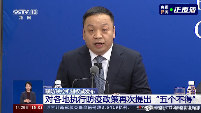 1月29日,国家卫健委发言人米锋在国务院联防联控机制新闻发布会上表示,对于近期出现的一些群众返乡受阻问题,国务院联防联控机制综合组对执行防疫政策再次提出明确要求,概括起来就是“五个不得”: