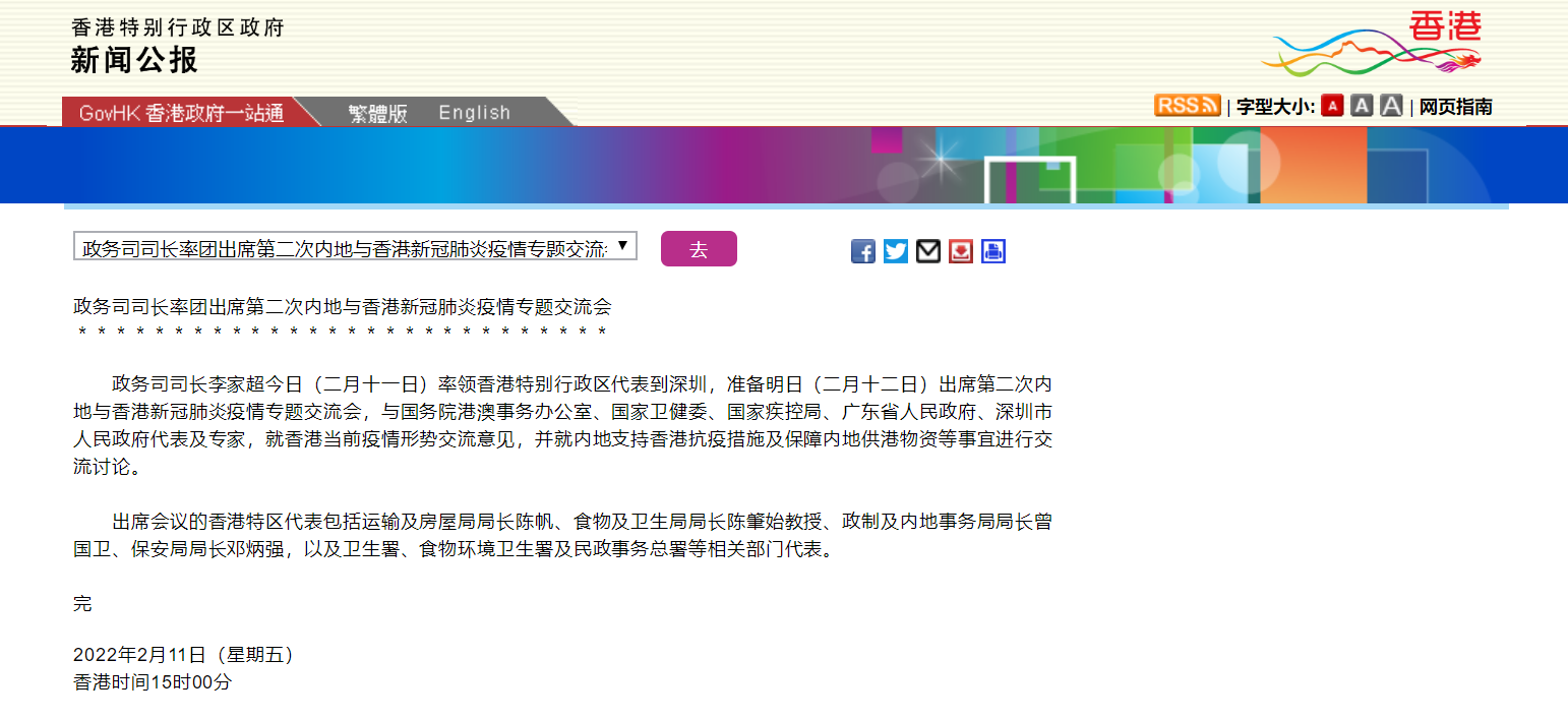 2月11日15时,香港特别行政区政府发布新闻公报,香港特区政府政务司司长李家超2月11日率领香港特别行政区代表到深圳,准备出席2月12日第二次内地与香港新冠肺炎疫情专题交流会,与国务院港澳事务办公室、国家卫健委、国家疾控局、广东省人民政府、深圳市人民政府代表及专家,就香港当前疫情形势交流意见,并就内地支持香港抗疫措施及保障内地供港物资等事宜进行交流讨论。