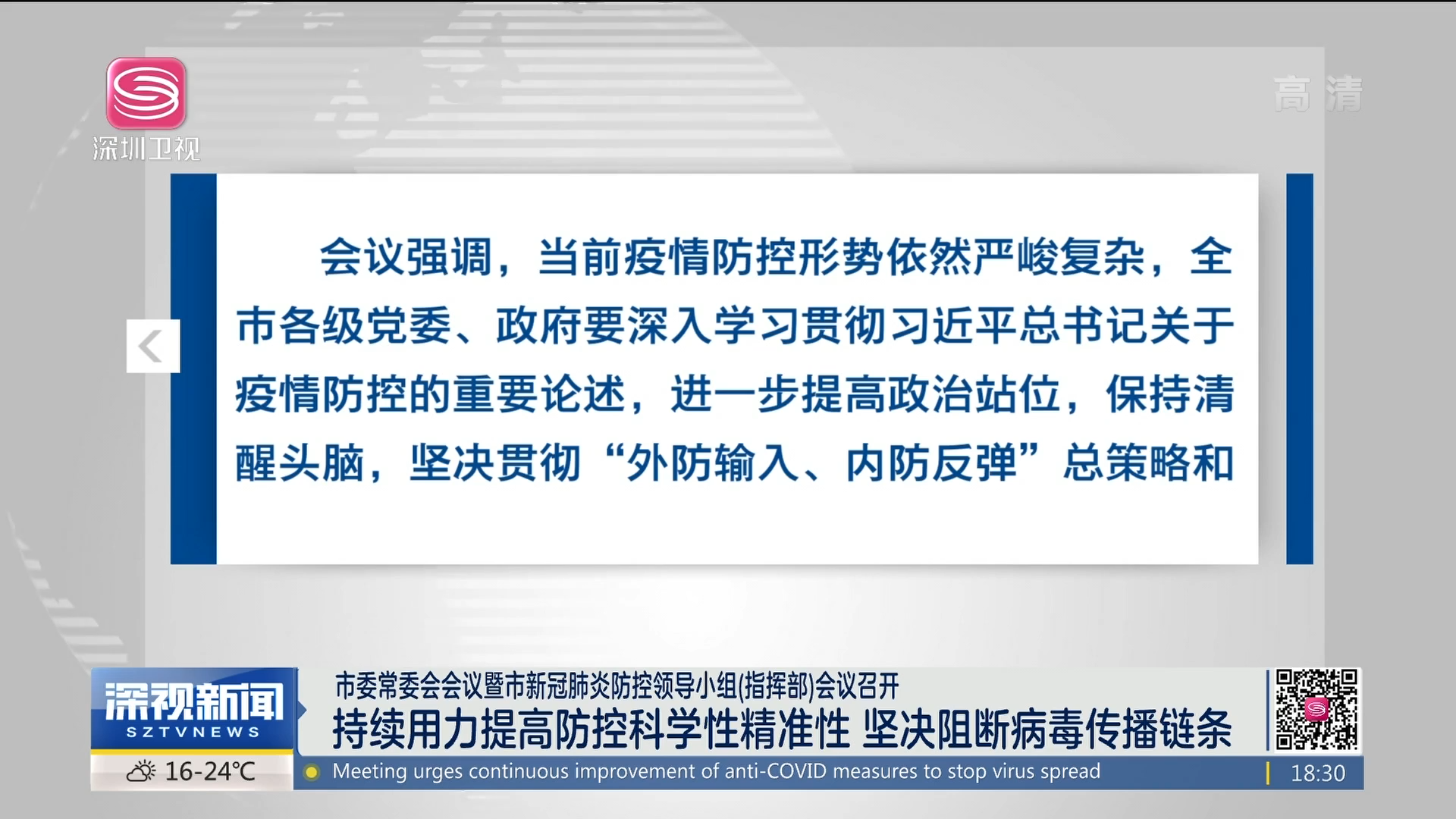 现在播送《深视快评:持续用力压实常态化疫情防控责任》。截至2月10号,深圳已经连续4天无本土新增病例,但疫情防控工作依然处在关键期,外贸大市、移民大市,叠加大规模人口流动的春运,给深圳带来了空前的防疫压力。如何打好打赢这场大仗硬仗?按照省委市委部署安排,我们要在坚决果断扑灭局部聚集性疫情,尽快实现“社会面清零”,持续用力应对好人员返程返岗高峰的同时,像抓安全生产一样抓疫情防控,进一步压实各区党委政府属地责任、主体责任和各部门监管责任,进一步关口前移、堵塞漏洞、完善制度。同时,全面摸清涉及进口物品生产、运输、加工、使用的企业底数,进一步压实企业防控主体责任,加强日常监测监管,切实提高工作的精准性有效性,坚决以硬干部硬作风硬措施,切实做到守土有责、守土担责、守土尽责、守土有方。