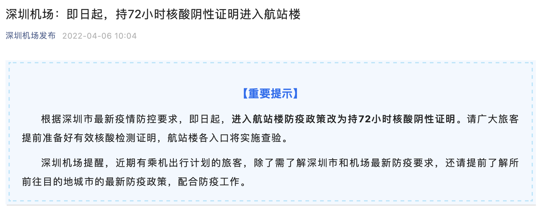 4月6日,深圳机场发布最新提示,据深圳市最新疫情防控要求,即日起,进入航站楼防疫政策改为持72小时核酸阴性证明。请广大旅客提前准备好有效核酸检测证明,航站楼各入口将实施查验。