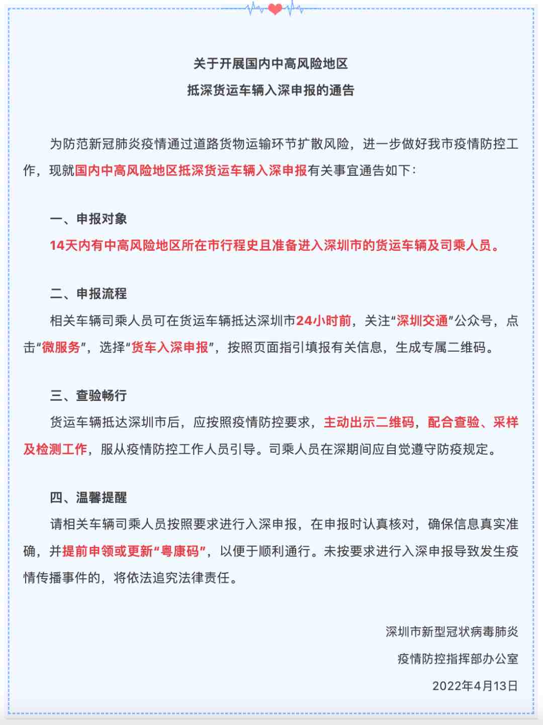 13日下午,市新冠肺炎疫情防控指挥部发布抵深货运车辆入深申报的通告,进一步防范新冠肺炎疫情通过道路货物运输环节扩散风险。