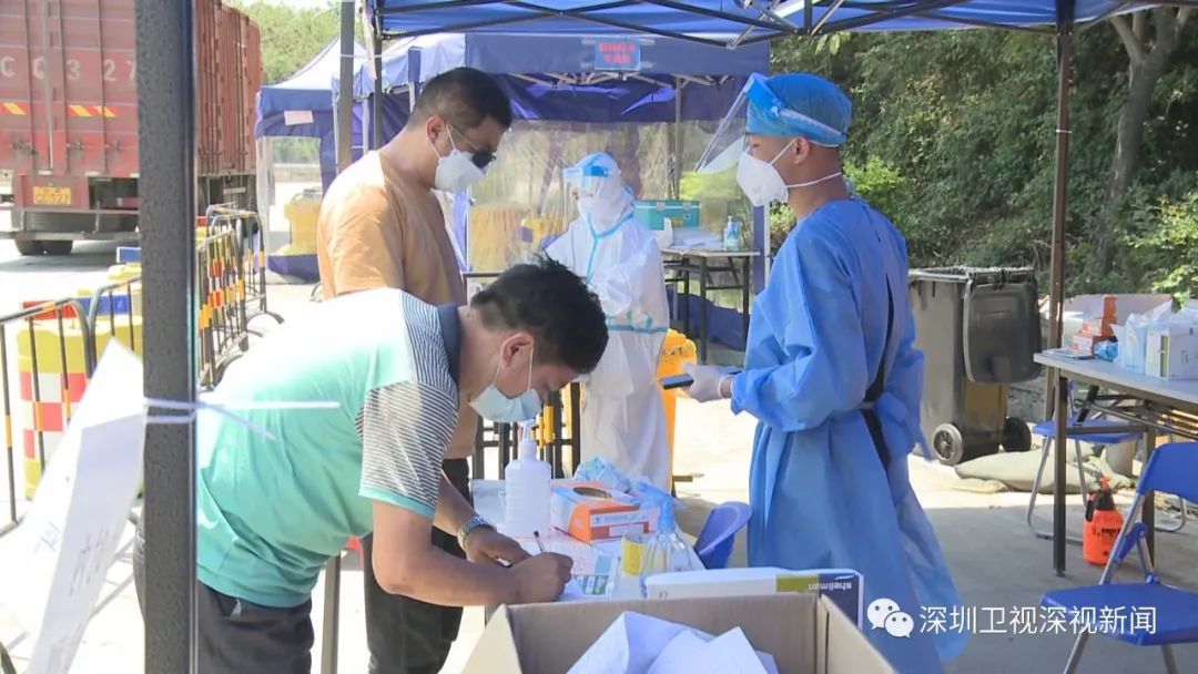 14日中午,在水官高速平沙收费站的入深通道,一批来自中高风险地区的货车集中抵深,工作人员引导司机靠边停车,进行信息核查及核酸检测。
