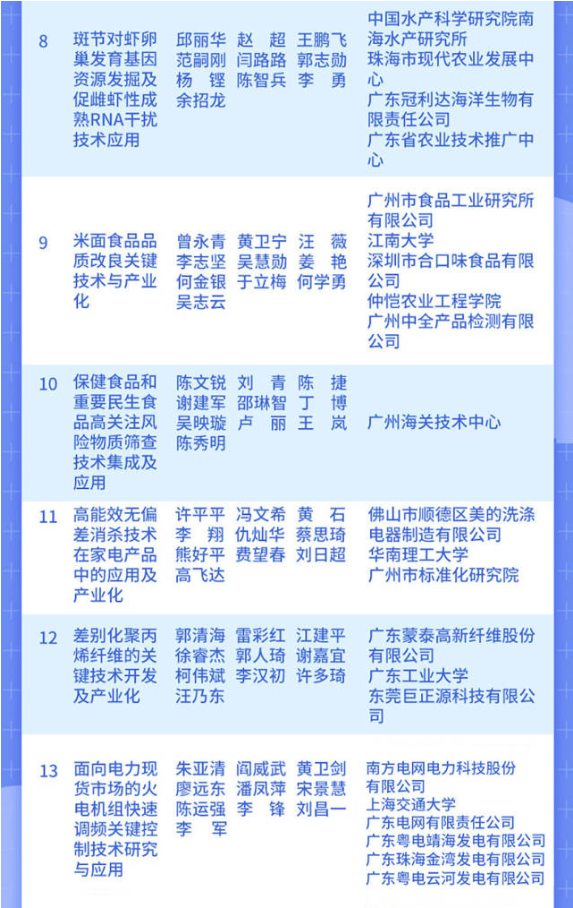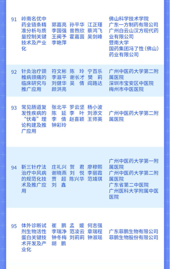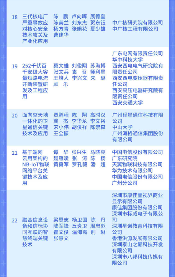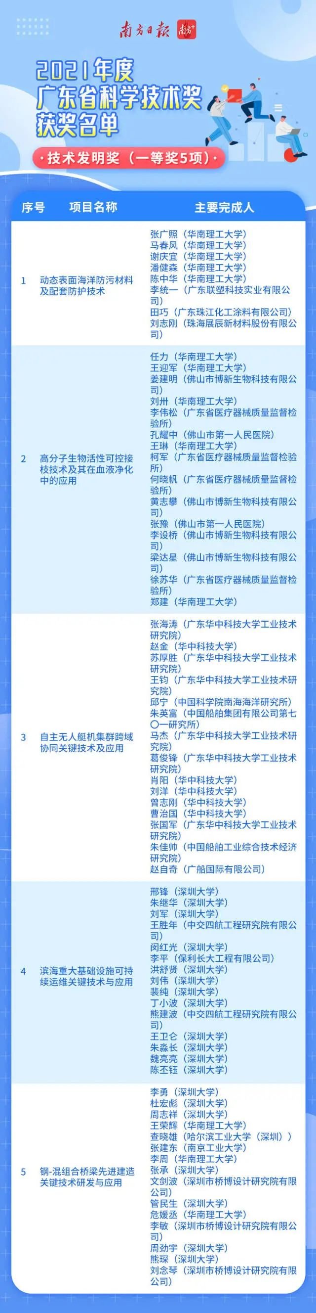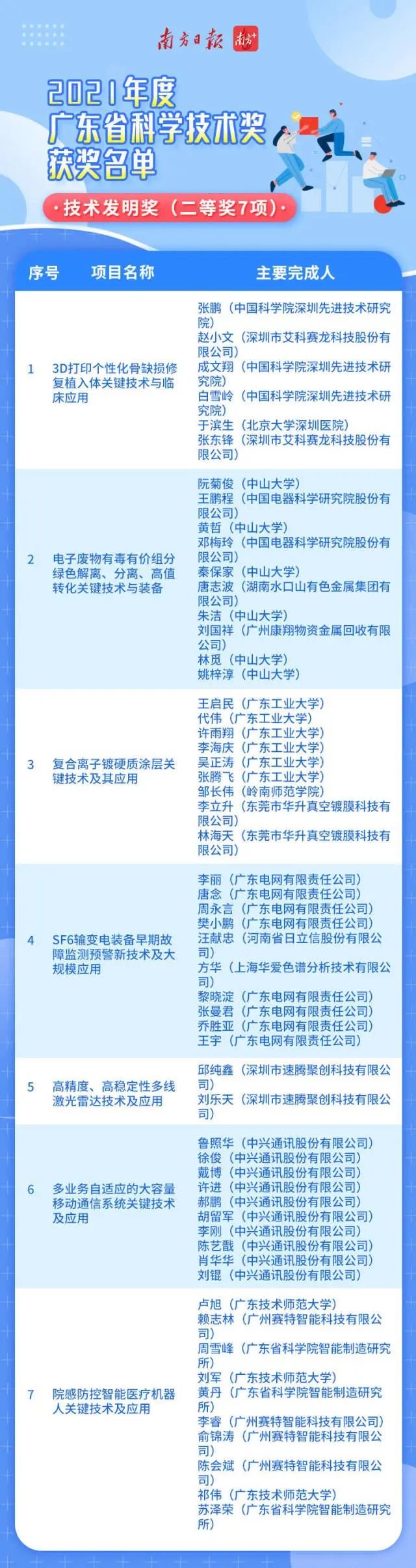 深圳大学陈泯融、何传新、胡琪等分获自然科学奖一、二等奖;深圳大学邢锋、中国科学院深圳先进技术研究院张鹏、深圳市艾科赛龙科技股份有限公司赵小文、北京大学深圳医院于滨生等分获技术发明奖一、二等奖;比亚迪等获科技进步奖特等奖,华为、大族激光、优必选、康佳、TCL、影石创新科技股份有限公司等分获科技进步奖一、二等奖。