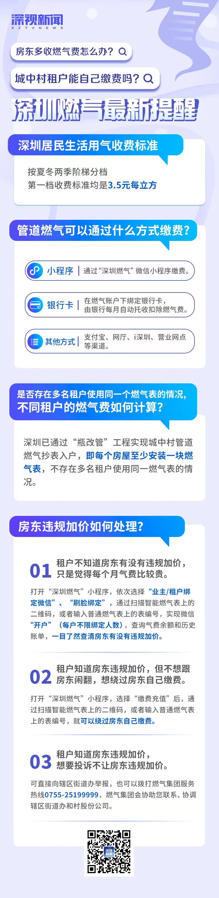 深圳燃气集团方面介绍,当前深圳市管道天然气价格由政府定价,实行阶梯气价。若租户知道房东违规加价,想绕过房东自己缴费。租户可以打开“深圳燃气”小程序,选择“缴费充值”后,通过扫描智能燃气表上的二维码,或者输入普通燃气表上的表编号,就可以绕过房东自己缴费。详情请戳下图↓↓