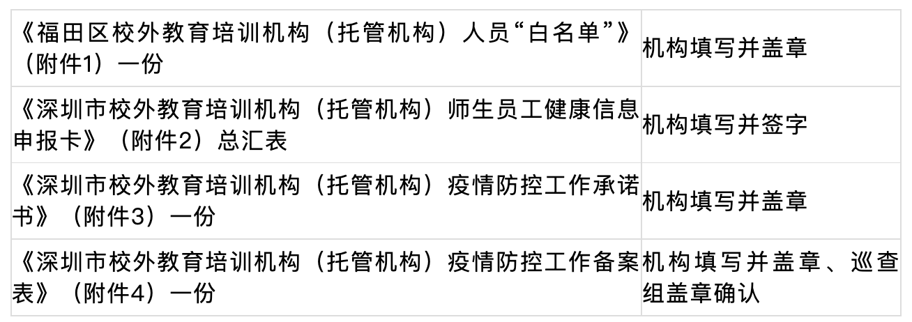 符合复课要求的机构,巡查组成员须在《深圳市校外教育培训机构(托管机构)疫情防控工作备案表》(附件4)签字、盖章确认,不符合复课要求的机构不予营业。