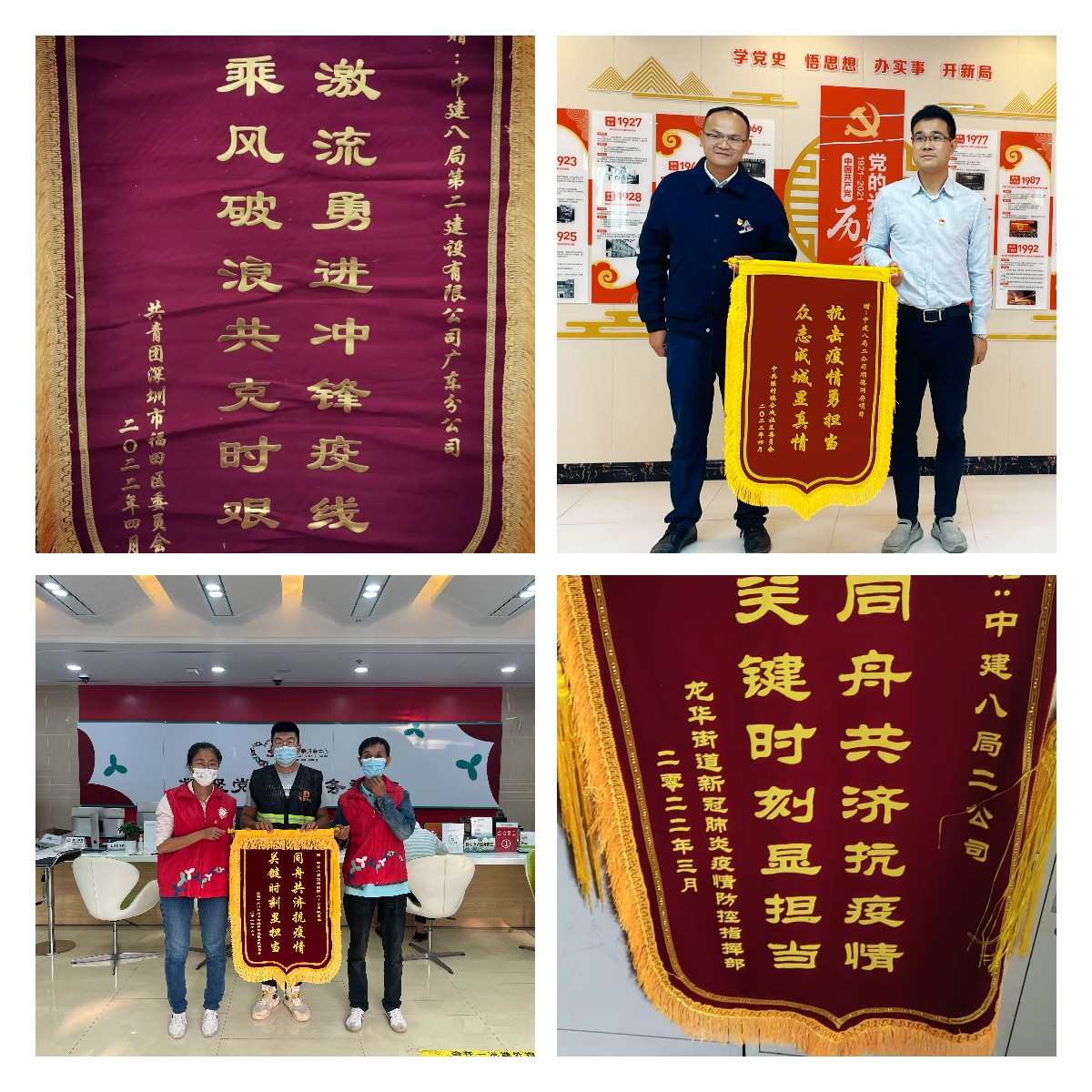 3月,公司组建3支疫情防控志愿服务队参与深圳市抗疫工作,56名志愿者先后到深圳市福田区、龙华区抗疫一线(封控区、管控区)开展志愿活动,为守护1万多名居民身体健康贡献了青春力量,被称为“八局铁军”,构筑起社区“内防扩散、外防输出”的“铜墙铁壁”,获得深圳市福田区团委和多个街道的锦旗和感谢信。