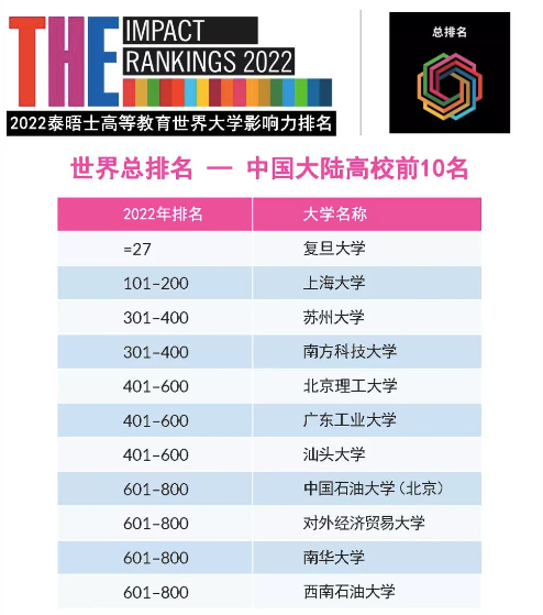 在可持续发展目标8—体面工作和经济增长的单项排名中,两所中国大陆高校进入世界前十,分别为复旦大学(第二名)、南方科技大学(第九名)。这项排名主要关注大学经济相关研究、就业实践和参加工作实习的学生比例。
