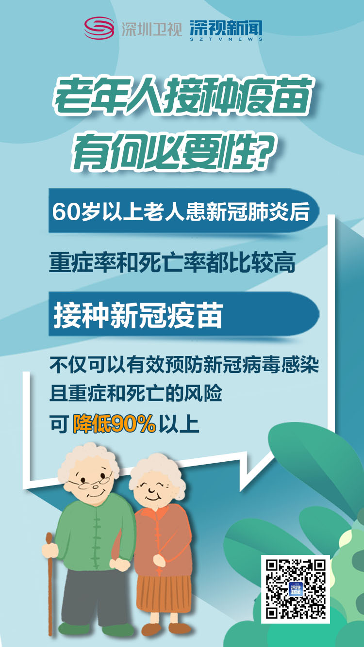 60岁以上老人患新冠肺炎后重症率和死亡率都比较高,接种新冠疫苗不仅可以有效预防新冠病毒感染,且重症和死亡的风险可降低90%以上。