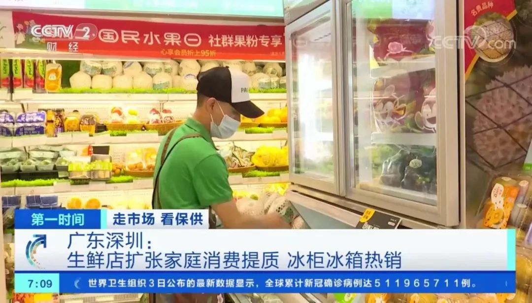 央视财经《第一时间》在“走市场 看保供”报道中特别提及深圳。报道称,广东深圳生鲜店扩张家庭消费提质,冰柜冰箱热销。