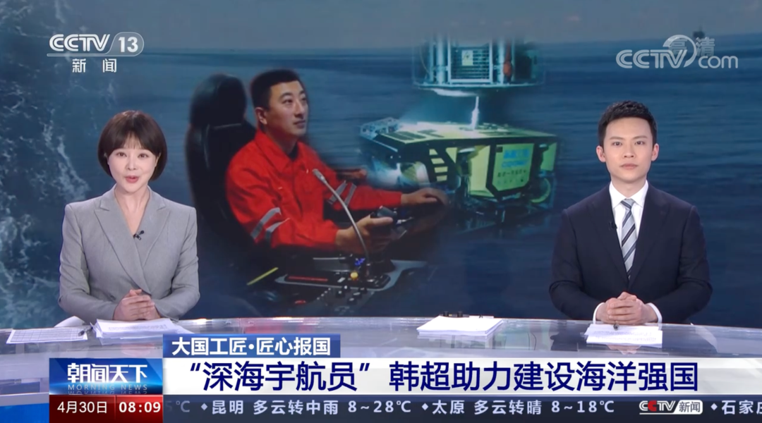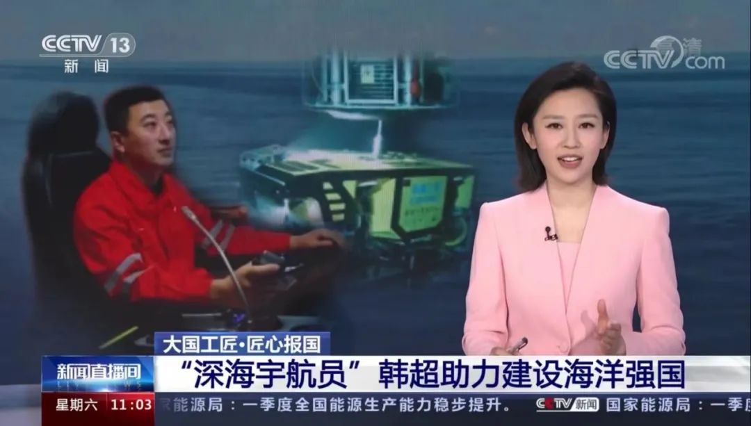 5月1日,《新闻联播》聚焦来自深圳的“大国工匠”韩超——一位在深海1500米烙下“中国印记”的深海宇航员。报道重点展现了水下机器人海底作业领航员们千里潜行、逐梦深海的“匠人风采”。