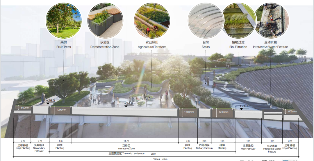 此外,在景观设计方面,把建筑占用的绿地提升至屋顶。景观平台的设置方便公众观览燕子岭,充分利用建筑及片区互动的有利因素,有助于改善“城市热岛效应”。